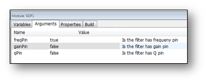 The SOFControl module allows for a control signal to adjust parameters (frequency, gain, or Q) of a second order filter. The control parameter(s) are selected in the module’s module properties. In this case, only the gain is controlled as shown below: