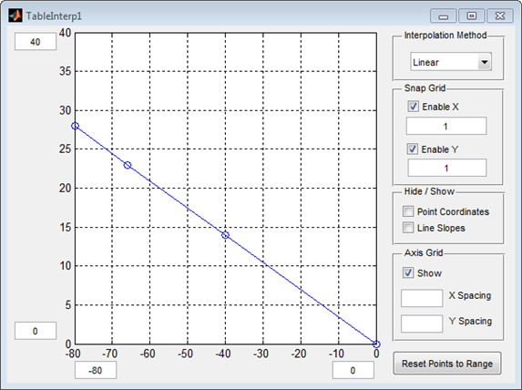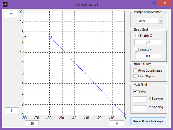 The TableInterp module allows the user to map out the intended input-output relation visually and interpolates between given points to produce a continuous function. In this case, the relation shown below will be sufficient: