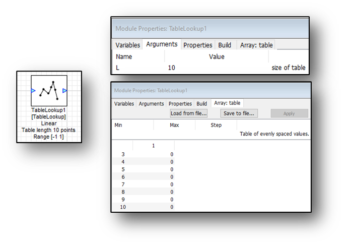 TableLookup uses either Linear or nearest interpolation. The user has to specify the upper and lower bounds of this table. Set the size of the table with the ‘L’ variable found in the arguments: