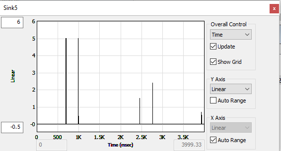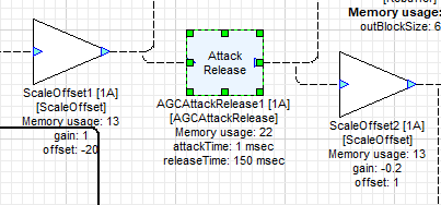 Note that the signal goes between 20 and 25. Our ultimate goal is to turn this into a gain control signal that starts at 1.0 when no pop is detected and goes down when a pop is detected. Our next step is to shift this signal so that it starts at 0 instead of 20, which is done using a ScaleOffset block with a Gain of 1.0 and Offset of -20.