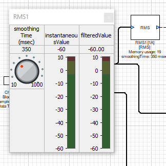 The RMS module computes the energy over an adjustable running window (the “smoothing time”).
