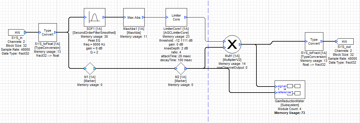 A GainReductionMeter subsystem has been added which lets you visualize the action of the limiter circuit. This is optional and can be eliminated after system tuning.