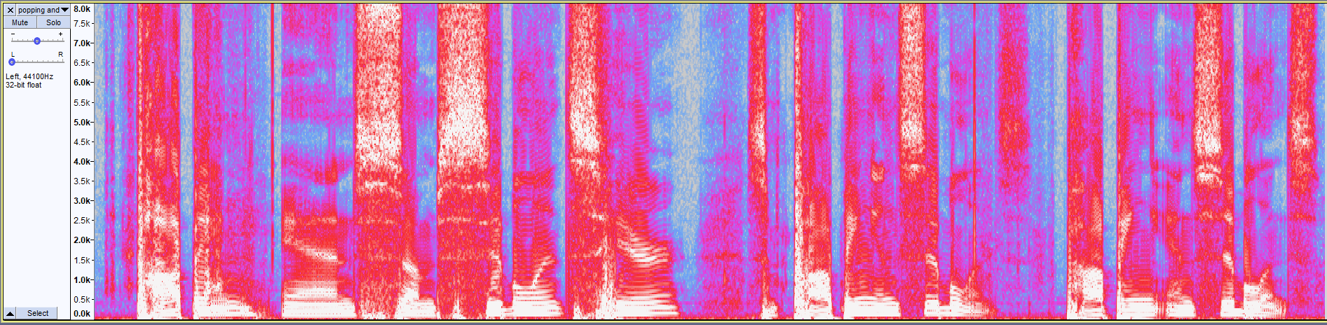 Another problem with microphones is that if the talker is too close then every plosive (a consonant with a puff of air like a “p”) causes a mini explosion. This also occurs with fixed microphones if the speaker bangs their hand on the podium or taps on the microphone enclosure. A spectrogram of a WAV file containing pops (the word “popping”) is shown below (yellow outline). A pop is characterized by a quick broad blast of energy across the spectrum. Compare that to sibilance (light green outline) which contains mostly energy above 4 kHz.