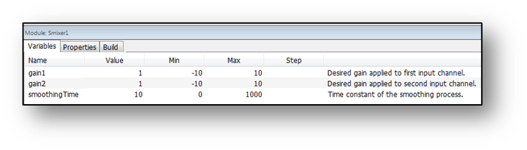 This mixer takes in two pins of arbitrary channel count and outputs the sum of the two with a scale factor specified in the module’s variables.