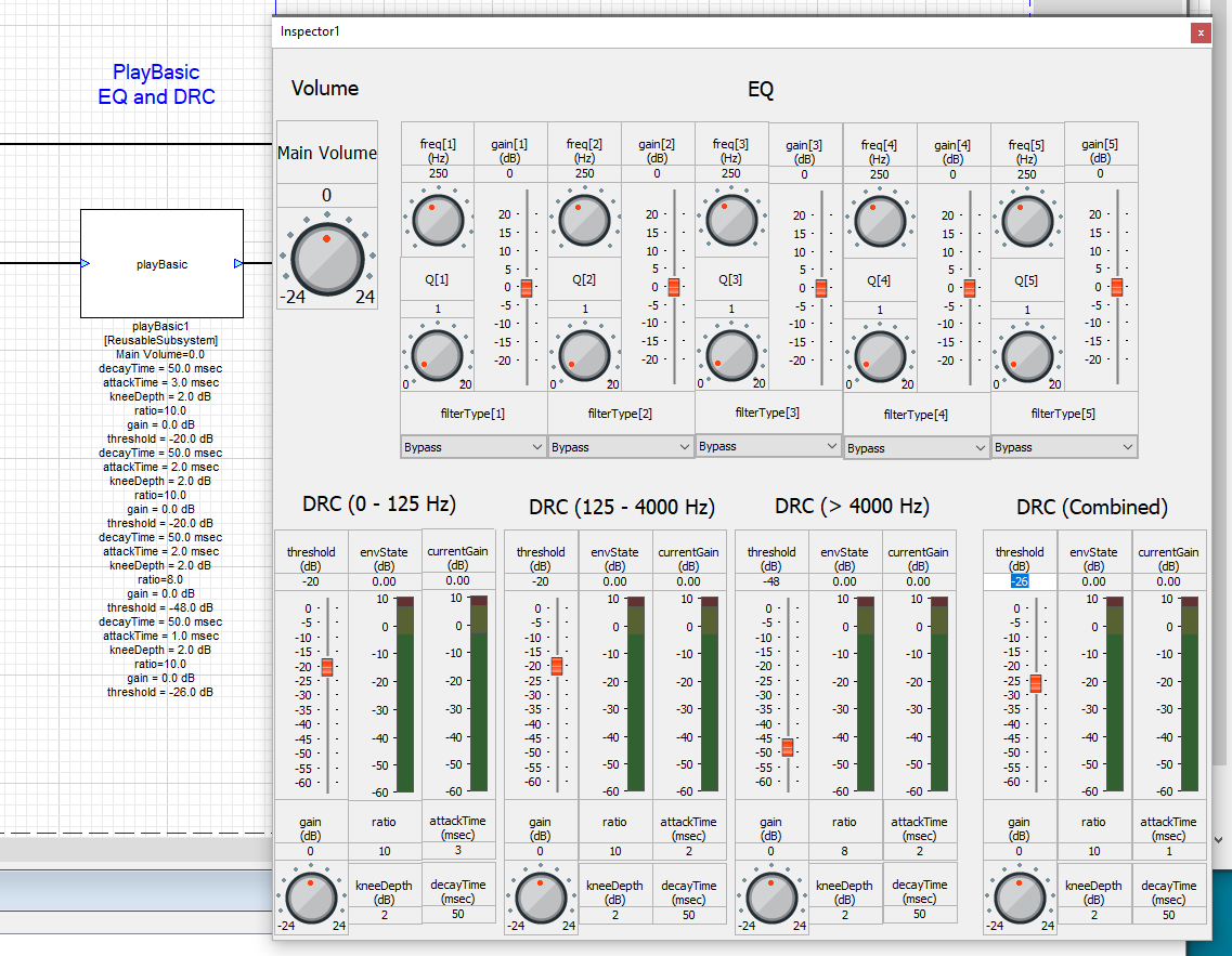 The PlayBasic Reusable Subsystem includes an inspector which allows users to tune the equalization filters, the main volume, and the compressors. Figure 3 show the inspector panel of the PlayBasic Reusable Subsystem.