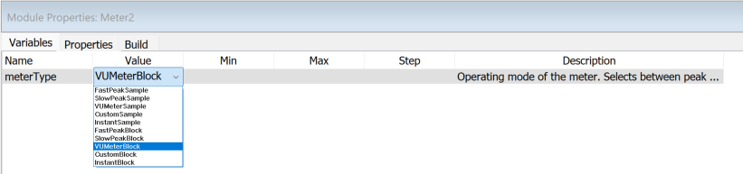 Right click on the module, go to properties, and switch tabs to get to variables. Operation modes of the meter selects between Peak and RMS calculations under variable ‘meterType’.