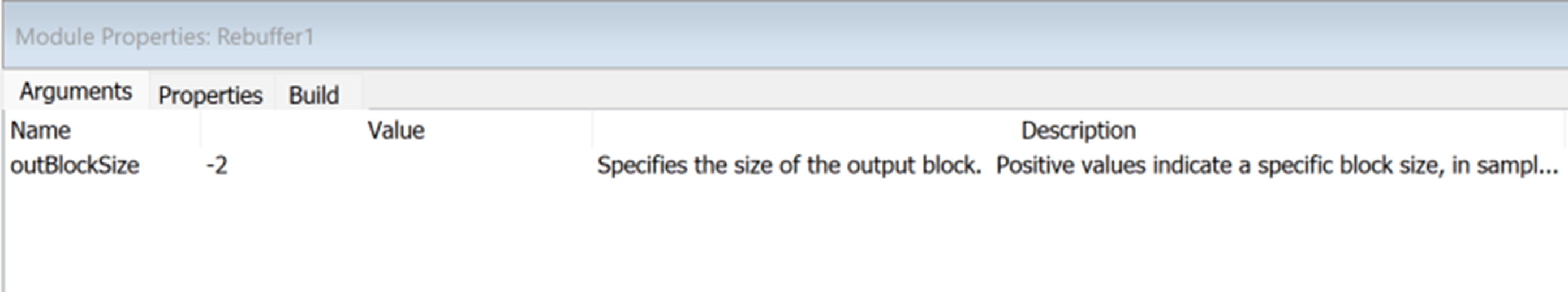 outBlockSize | Specifies the size of the output block. Positive values indicate a specific block size, in samples. Negative values specify a multiplicative factor between the input and output block sizes. | By default, outBlockSize = -2. | -32:100000 |