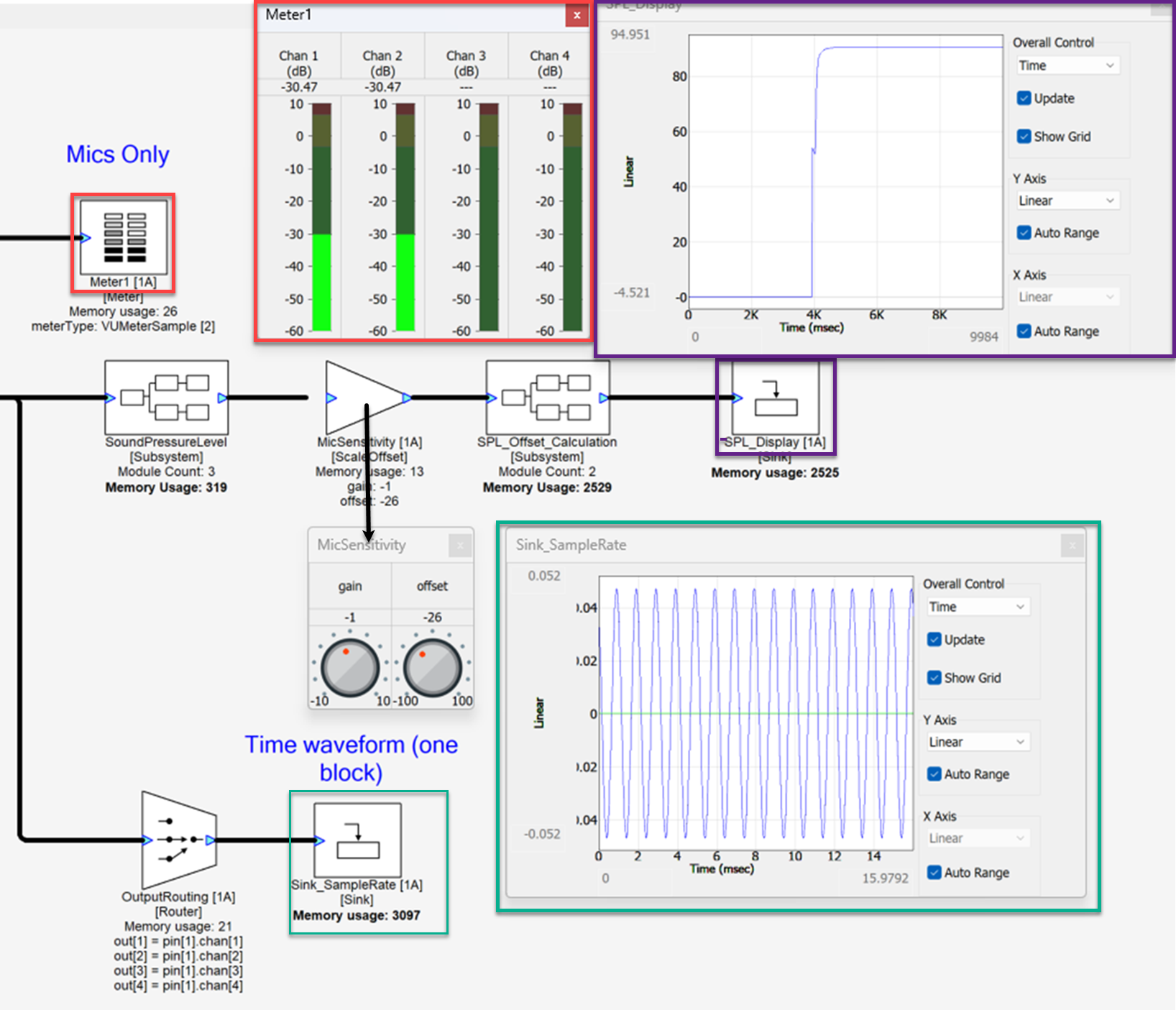 In this example we will be using an input signal of 1kHz Sine Tone via two input channels. The Meter module is selected in VUMeterSample mode and represents the amplitude of the input signal. In this example we are converting the input signal into an SPL output of dBA weighting by inputting the microphone sensitivity in the ScaleOffset module as shown below with the arrow. The SPL_Display sink plots a graph of the SPL level of the input channels (in dBA) as shown in the purple blocks. You can also verify the sample rate of the input signal by using the sink display again and counting the number sine cycles present in the window as shown in the green box highlights. The Sample Rate is calculated by