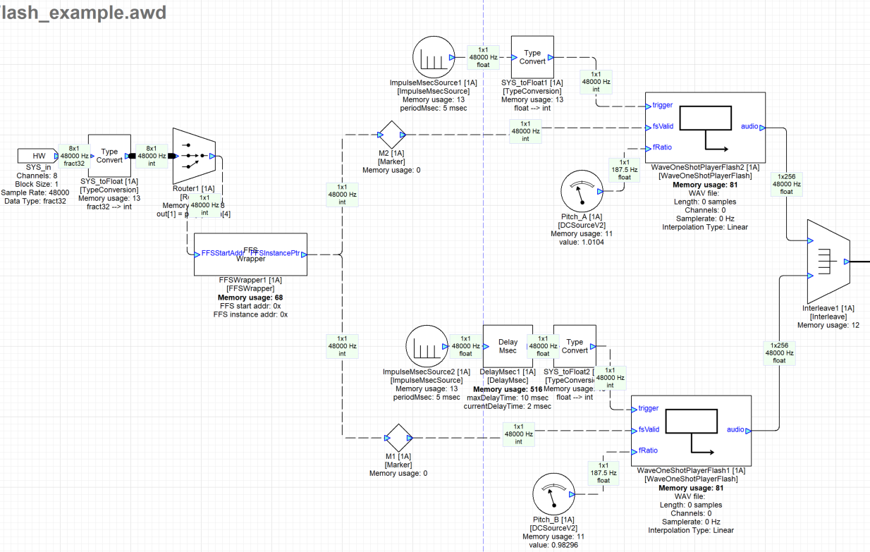 We are using the same Ping Pong example as above. The only difference here is that the Flash module extracts wave data from AWE Flash File System container on the target Flash device, based on WAVFILE argument. User must specify the file name as an argument and can also change file name directly into fileName array as 32-bit packed data during run time.