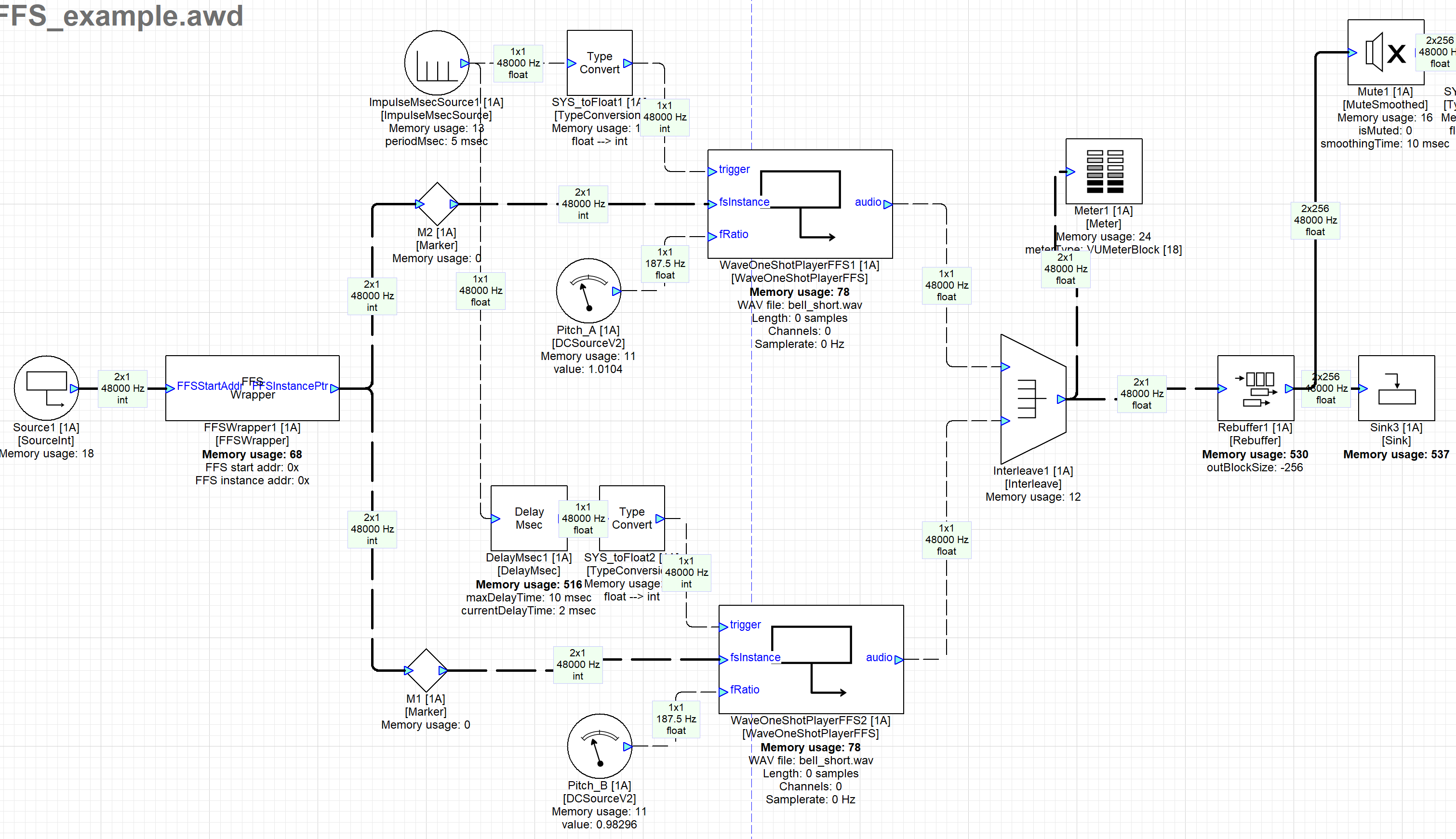 The RAM module starts playback of a wave file provided by the user which is stored as a buffer array. The example below describes the workings of a wave one shot player RAM module. In this example we are taking two RAM modules and have stored two short wav files. The two RAM modules are working alternatively in a Ping-Pong manner. DC sources named PitchA and PitchB are used to vary the pitch of RAM1 and RAM2 respectively. In this example we are using an Impulse source for both the wave modules as a trigger to start playback of the wave files respectively. RAM2 has been given a delay of 2 msec which in turn creates the Ping Pong effect. The wav file used here is a Bell sound.