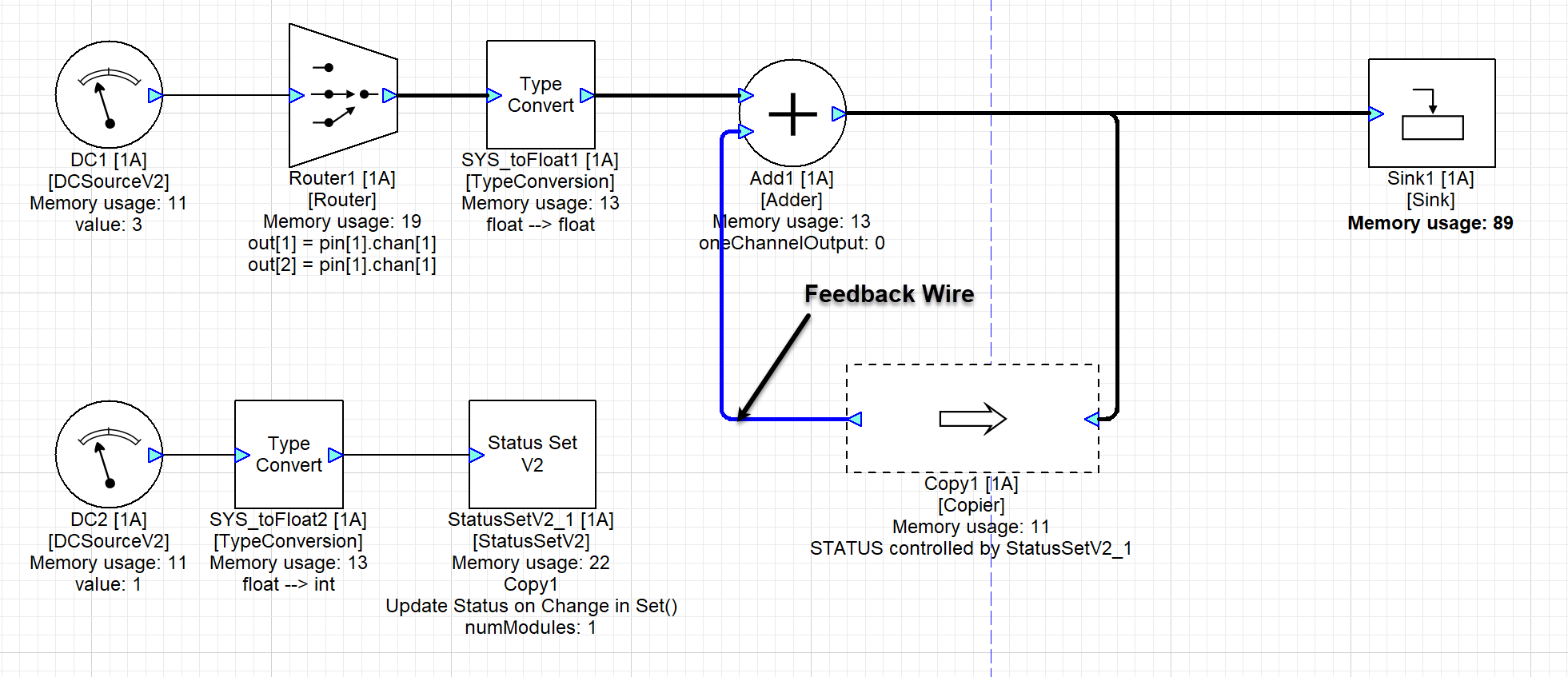 In this example by changing the Feedback_DC value to 3 then the Copier module becomes inactive effectively stopping the feedback loop and stopping the output of the adder. Whereas when the Feedback_DC value is 2 the Copier module becomes mute and starts pumping zeros instead into the feedback loop. The output of the Adder is the value of Adder_Input1 in this case.