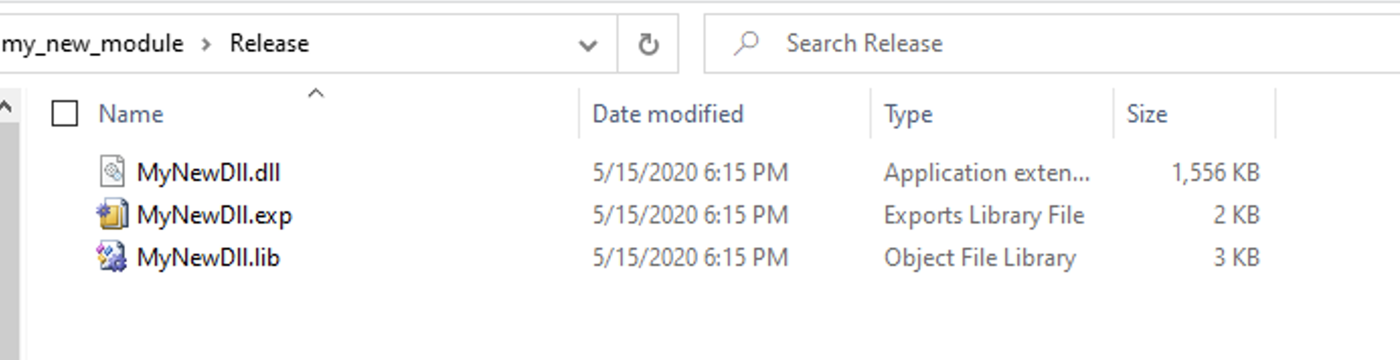 Creating the Windows DLL requires two separate Microsoft Visual Studio projects: one to create a static library and one to create the DLL. The wizard creates a Microsoft Visual Studio Solution file (.sln) with these projects. To create the module pack DLL, build the solution for x86 using Visual Studio. The module pack DLL and .lib files will be created in the Release or Debug folders of the module pack folder as shown below: