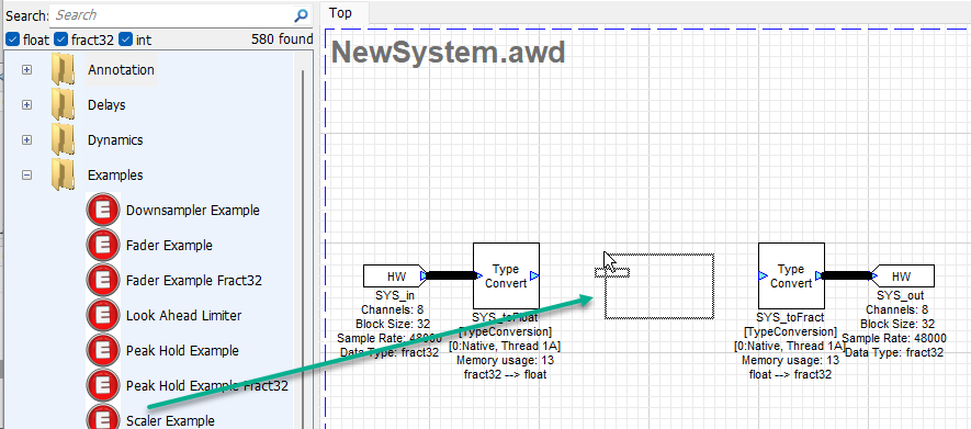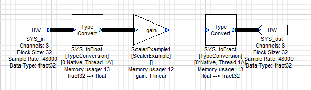 In this example layout, we have started by removing the deinterleave and interleave modules from the default layout. Find the “Examples” folder in the Module Browser and drag a Scaler Example module into your layout.