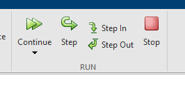 If you single step past the end of the current MATLAB file, you will see a downward pointing green arrow. Generally speaking you should click on “Continue” at this point rather than “Step”.