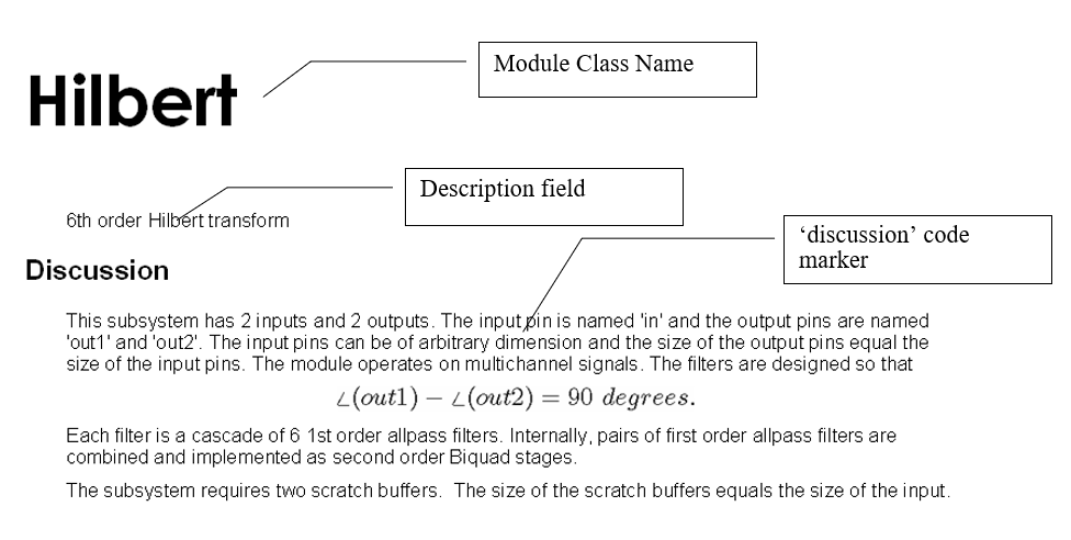 Audio Weaver supports adding equations to the discussion section of a module. Equations are entered as text commands within the 'discussion' portion in LaTeX format. Equations must be enclosed between dollar signs. For example, $\angle(out1)-\angle(out2) = 90~degrees.$ is expanded to ∠(out1) - ∠(out2) = 90 degees in the document. If you are new to LaTeX, there are many good references available online.