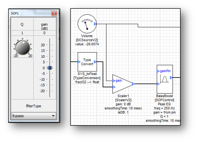 The complete system (shown below) has a few key points. As the volume is reduced at the DCSource, the levels of the bass and treble frequencies will be boosted so that they sound as though they are dropping off at the same rate as the mid-range frequencies. Note the dotted lines representing all the control signals. This implementation is also computationally efficient. The control signals have a block size of 1 and do not require much computation. The main processing is performed by the Scaler and two SOFControl modules.