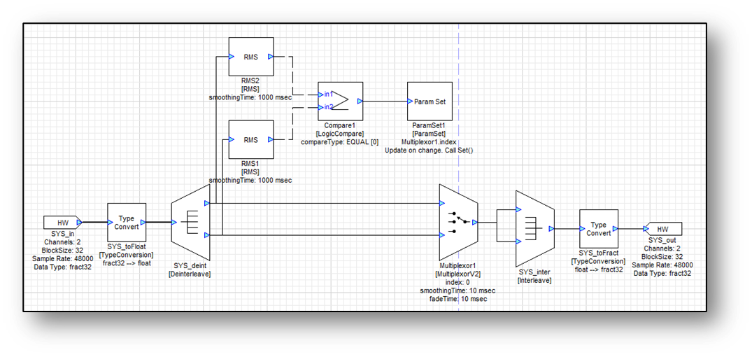 A simple example of the use of the Boolean signals is shown below. This system selects the louder of the two input channels and outputs it on both channels. To accomplish this, the RMS module measures the levels of the two input signals and outputs control signals. These control signals are then fed into a LogicCompare control, set to LESSTHAN comparison type. Its output controls the index of the MultiplexorFadeControl module which selects the louder of the two input channels.