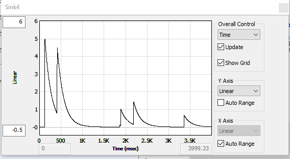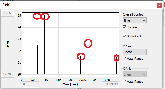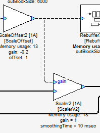 Note that the signal goes between 20 and 25. Our ultimate goal is to turn this into a gain control signal that starts at 1.0 when no pop is detected and goes down when a pop is detected. Our next step is to shift this signal so that it starts at 0 instead of 20, which is done using a ScaleOffset block with a Gain of 1.0 and Offset of -20.