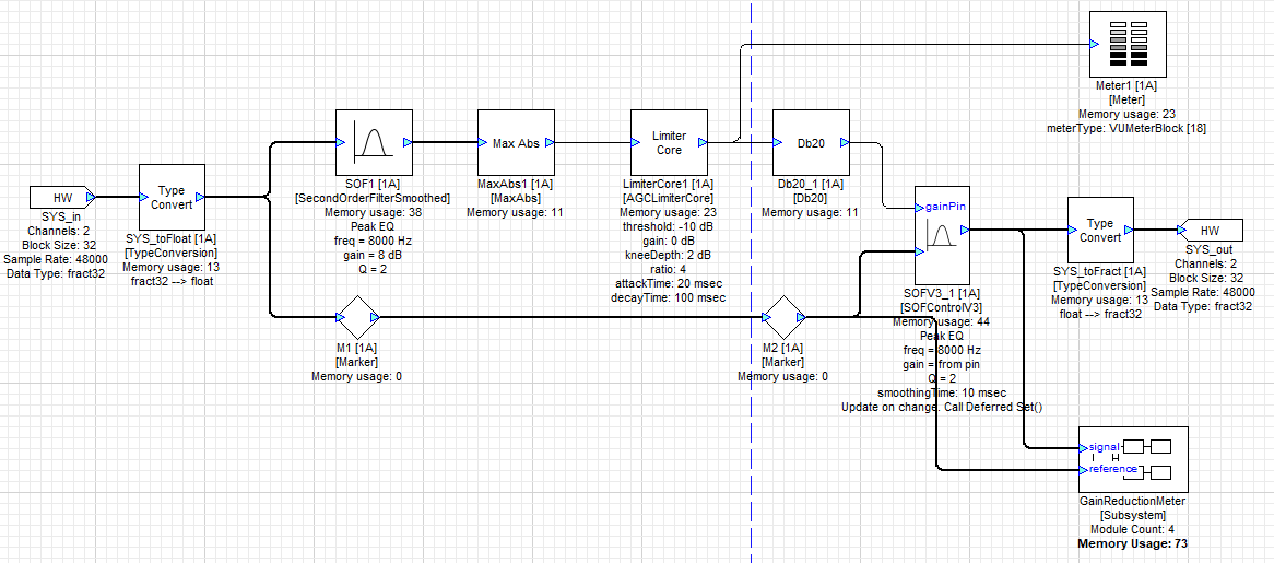 A GainReductionMeter subsystem has been added which lets you visualize the action of the limiter circuit. This is optional and can be eliminated after system tuning.
