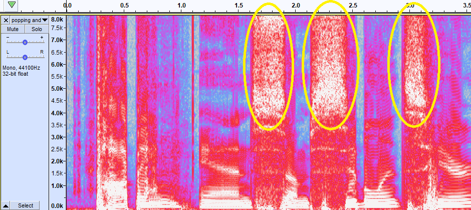 Another problem with microphones is that if the talker is too close then every plosive (a consonant with a puff of air like a “p”) causes a mini explosion. This also occurs with fixed microphones if the speaker bangs their hand on the podium or taps on the microphone enclosure. A spectrogram of a WAV file containing pops (the word “popping”) is shown below (yellow outline). A pop is characterized by a quick broad blast of energy across the spectrum. Compare that to sibilance (light green outline) which contains mostly energy above 4 kHz.