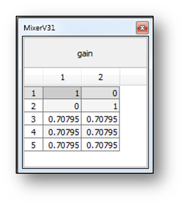 A Mixer is an M x N array of gains that transform M input channels into N output channels. This is useful for combining signals together, and consolidating many gain values into a single module. Our Mixer module is smoothed, and optimized based on the amount of non-zero coefficients specified by the user. It supports input pin controls or single pin, multi-channel controls. A mixer is good for handling many channels at once, so it excels in the algorithm for downmixing from surround sound 5.1 to stereo. This means transforming 5 input channels to 2 output channels: