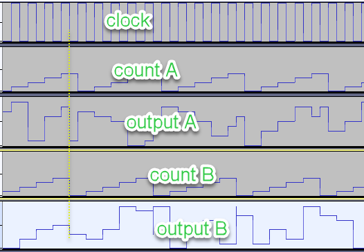 Output A (can) reset halfway through its normal cycle, driven by count B’s overflow.