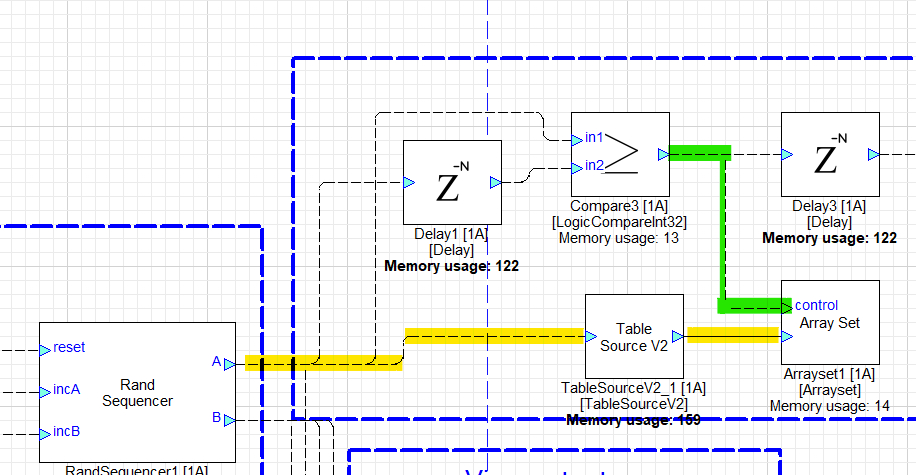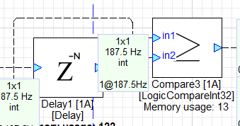 Because these are control signals (indicated by the dotted lines connecting modules), they are set to a block size of 1. Turn on Wire Info and Accumulated Delay under the “View” menu to see the details.