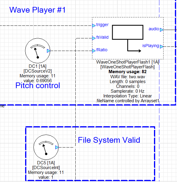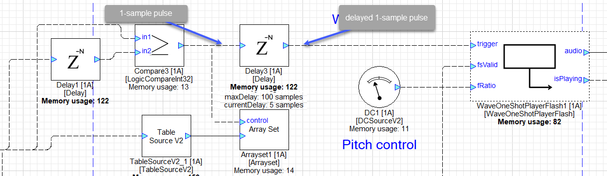 The 1-sample width pulse coming out of the comparator loads the selected encoded WAV file name from the TableSourceV2 into WavePlayerOneshotFlash1’s fileName variable.