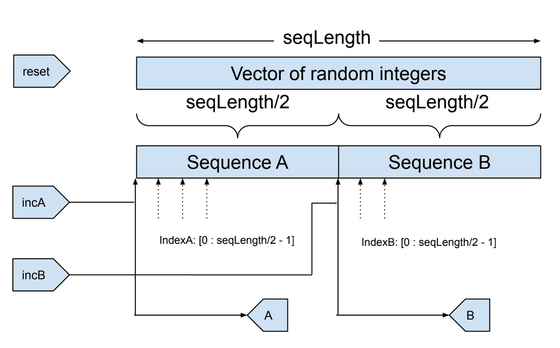 Internal variables IndexA and IndexB are incremented by the incA and incB inputs, respectively. The individual indices are used to read the entry from the corresponding sequence and present it at the corresponding output. When either index is incremented from (seqLength/2 - 1), IndexA and IndexB are both reset to 0 and the random vector is regenerated.