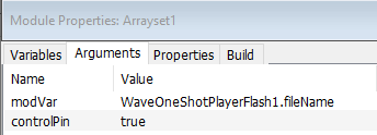 When the fileName of the WaveOneShotPlayerFlash1 module is updated by the ArraySet1 module, a delay is required before you can reliably trigger the new WAV file. The amount of delay depends on: