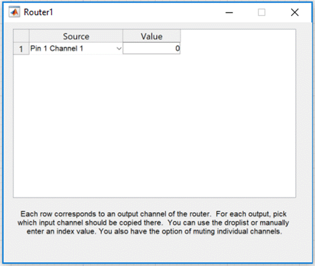 The output channels do now have to be in the same order as the inputs. For example, suppose you had a stereo signal and you want to swap the order of the left and right channels. Create the Router module with 1 input pin and 2 output channels. Then set: