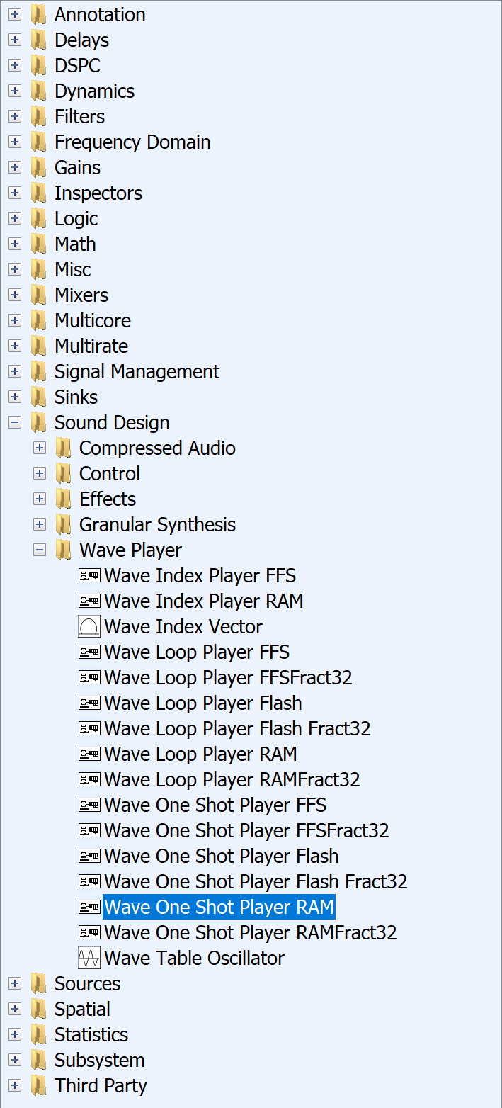 The WaveOneShotPlayer module is WAV file player. This module three different variants along with their Fract32 versions.