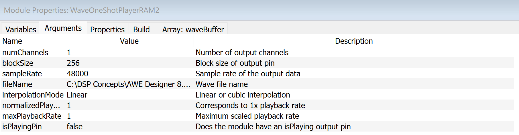 Figure 5: Argument Tab for WaveOneShotPlayerRAM