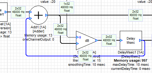 The example below shows a layout with two DelayMsec blocks in series. The Accumulated Delay of the second DelayMsec block shows the delay, which is the sum of the incoming delay (12000 samples) and its own internal delay (5760 samples) for a total of 17760 samples.