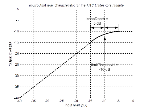 The limiter includes a soft knee which causes the attenuation to kick in gradually. The knee is a quadratic function extending from limitThreshold – kneeDepth to limitThreshold + kneeDepth. Due to manner in which the knee is implemented, kneeDepth must always be > 0. The figure below illustrates the input / output level characteristic with: