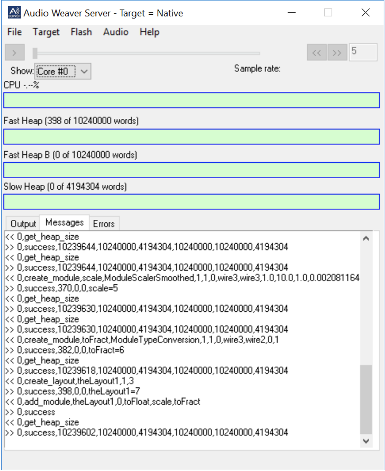 Ensure that there is only one file in the flash file system.Shut down the Audio Weaver Server and reset the target. The target will execute agc_example.awb at boot time and you'll immediately hear audio being processed.