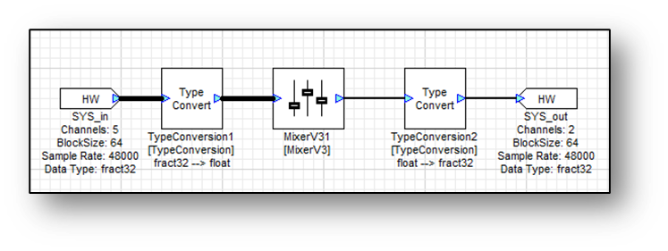 A Mixer is an M x N array of gains that transform M input channels into N output channels. This is useful for combining signals together, and consolidating many gain values into a single module. Our Mixer module is smoothed, and optimized based on the amount of non-zero coefficients specified by the user. It supports input pin controls or single pin, multi-channel controls. A mixer is good for handling many channels at once, so it excels in the algorithm for downmixing from surround sound 5.1 to stereo. This means transforming 5 input channels to 2 output channels: