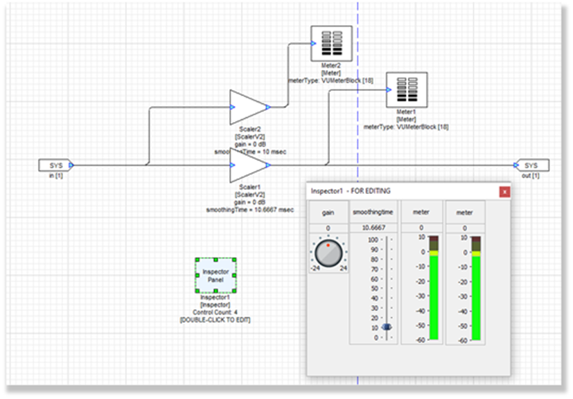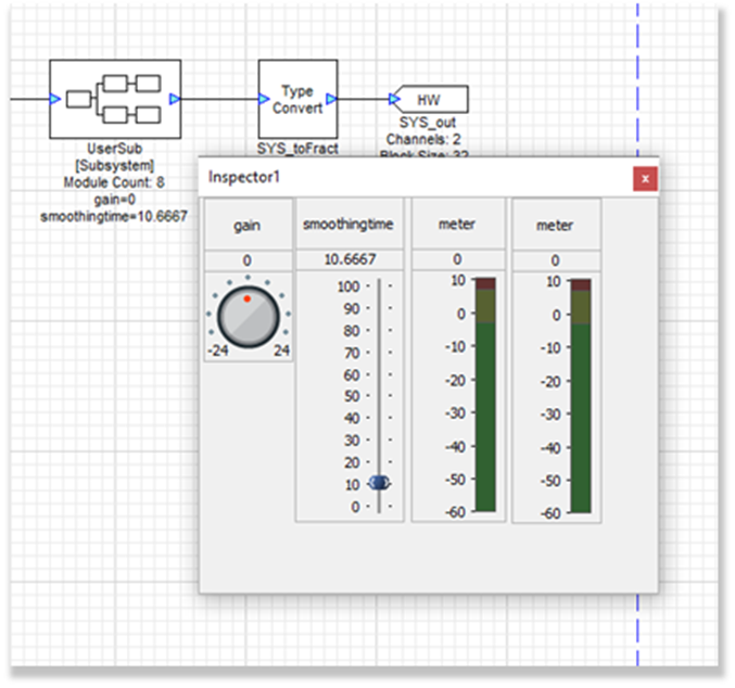 Next, ascend the hierarchy to the top level, where double clicking the subsystem will show the inspector dialog in Control Mode. Control Mode can be used during design time or run time to change the values of the module variables linked to each inspector control. For example, the knob control will change the subsystem’s gain module variable. The subsystem module block will show updates of the values as in the next figure: