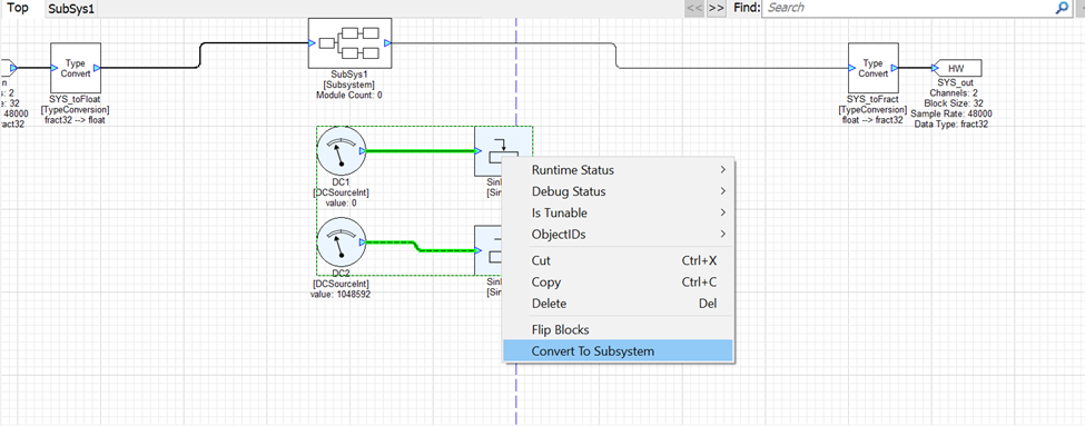 Instead of dragging out a new subsystem and manually adding modules, a user can create a subsystem from an existing set of modules. To do this, select a module or set of modules, right click, then select the Convert To Subsystem option. This will replace the selected modules with a new subsystem that contains the selected modules. Just as usual, a user can navigate through the different hierarchies with the ‘Navigate Up’ or ‘Navigate In’ options.