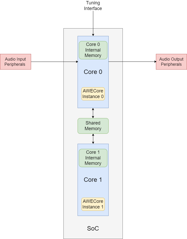 In this typical multicore SoC architecture, an instance of AWE Core can be placed on each core. The shared memory of the SoC is utilized by AWE Core to communicate between the two instances, as well as buffer audio data between instances. AWE Core handles all data exchange between instances; no user protocol or software needs to be written to facilitate.