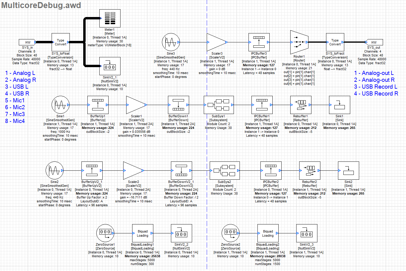 AudioWeaver provides a single design canvas which can place modules on any instance. Audio data can be routed between instances in one design file, which allows users to move processing loads seamlessly to available cores on an embedded target. The below example canvas has processing distributed over two AWE Core instances residing on two different processing cores.