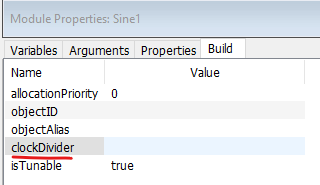 In the bottom pane that appears, select the Build tab, and locate the clockDivider field.