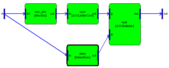 This subsystem is designed to operate on an arbitrary number of channels. However, the wire allocation shown above is only applicable when the input is mono. (To see this, consider the MaxAbs module. This module always has a mono output and is assigned to wire #3. The signal path through DelayMsec can be N-channel and is also assigned to wire #3). If this system is run with stereo inputs, then the wire allocation is incorrect and the audio processing will fail.