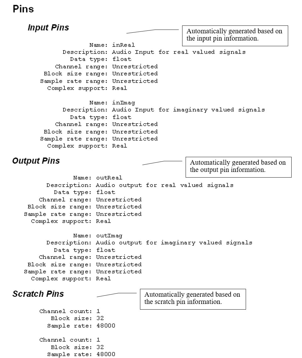 ● Scratch pin requirements and how the sizes relate to the sizes of the input and output pins. The automatically generated information lists out the scratch pin sizes, but the values shown are only based on the current module settings. The relationship between the scratch sizes and other pin sizes is not described in the automatically generated text.