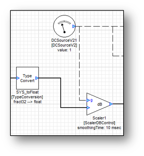 The VolumeSetting module is a DCSource which outputs the gain setting, in dB; this is a control signal and is drawn as a dotted line. When configuring the VolumeSetting using module properties set its blockSize and number of channels to 1.