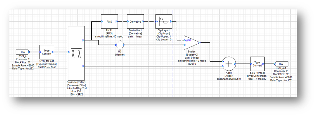 The RMS module computes the energy over a 40 msec running window and the derivative module looks for changes in energy. Constant low frequency energy doesn’t trigger the limiter at all.