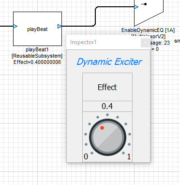 The PlayBeat Reusable Subsystem includes an inspector which allows users to tune the strength of dynamic excitation (the strength of low-frequency beat emphasis) using an Effect knob. The Effect knob ranges from 0 to 1, with 0 yielding no effect and 1 yielding the strongest effect. DSP Concepts recommends using 0.4 as a default. A stronger Effect setting may cause low-frequency clipping distortion.