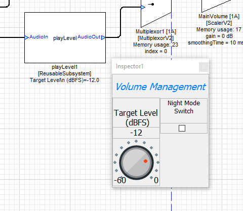 The PlayLevel Reusable Subsystem includes an inspector which allows users to adjust the output signal level and toggle Night Mode on and off. Figure 3 show the inspector panel of the PlayLevel Reusable Subsystem.