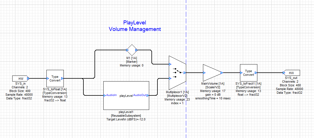 Figure 1: Example layout demonstrating the PlayLevel Reusable Subsystem with a stereo input