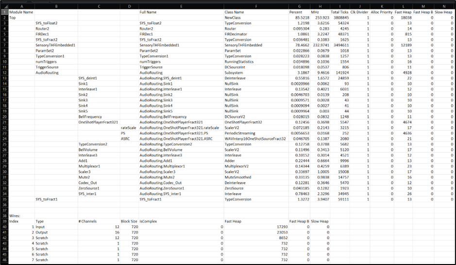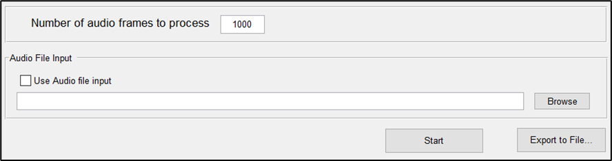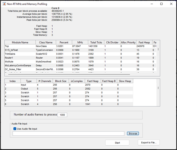 In the Manual Profile Settings, you can set the number of audio frames/blocks of audio to process and an audio file to be used as input audio data. Manual Profiling also supports .csv exports of the profiling data: